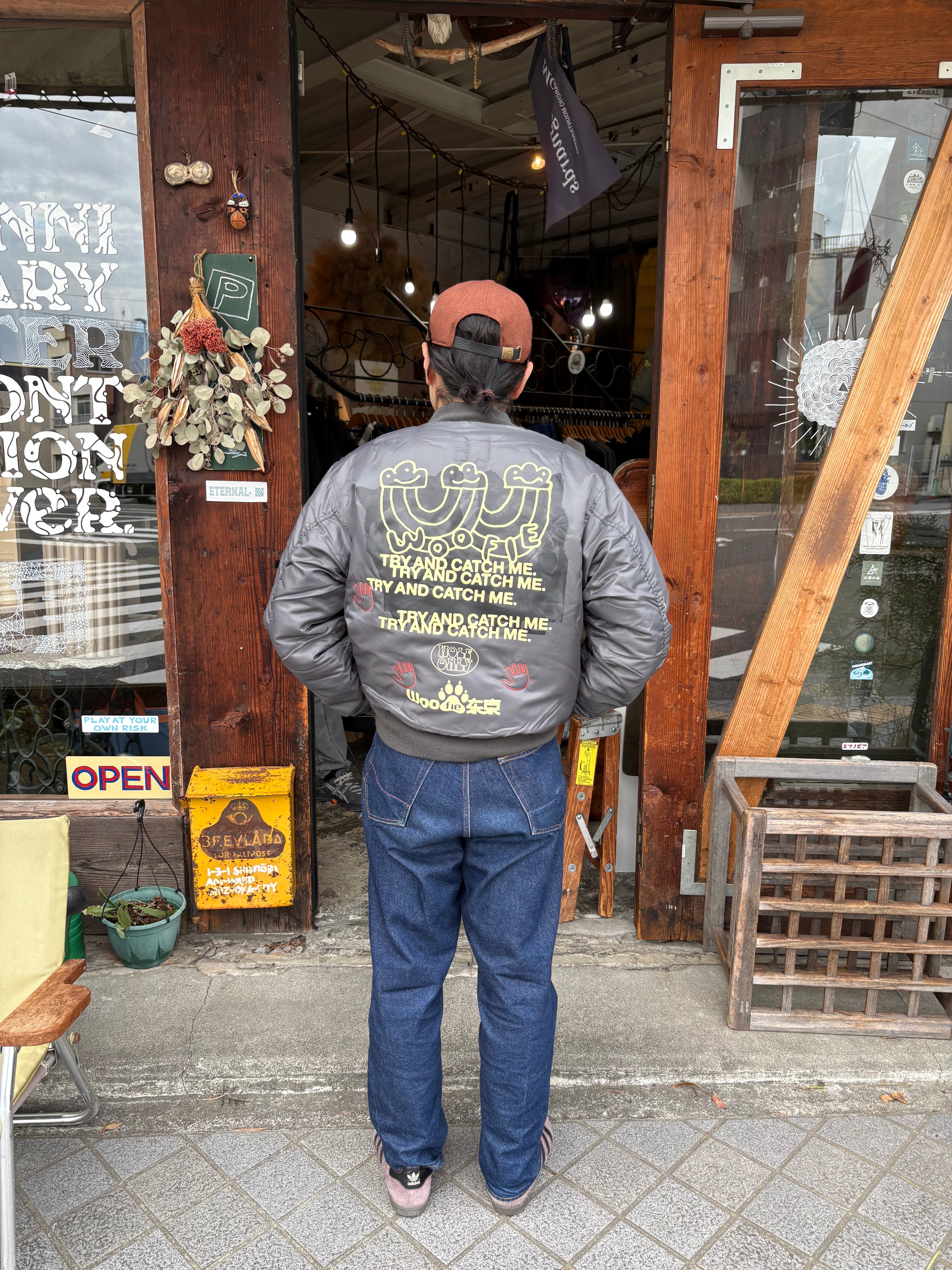 MA-1の全体に、刺繍、プリント、ワッペンが散りばめられたデザイン。