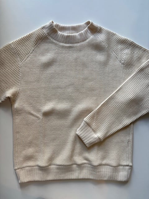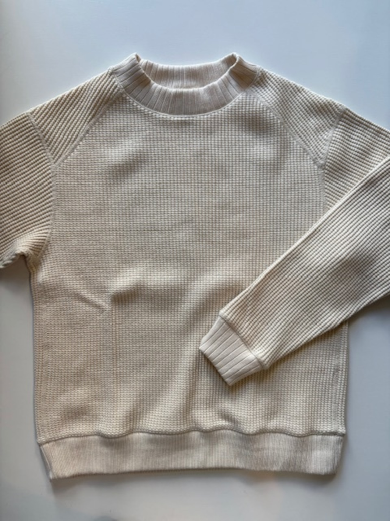 首元、袖口、裾は、硬めの針抜きリブを使用。