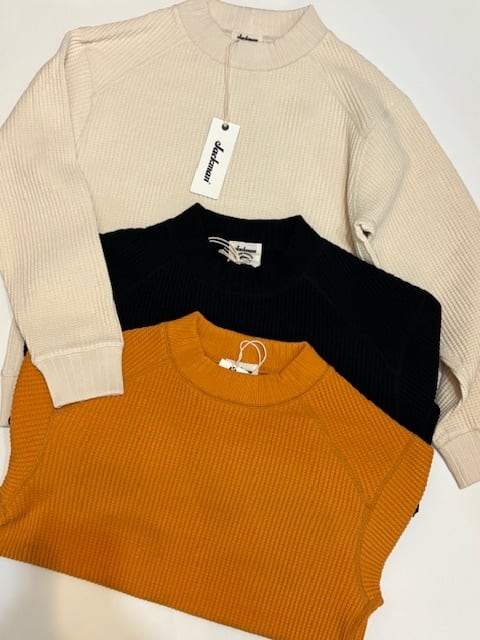 ジャックマンオリジナルのこのビックワッフルは、着用と洗濯による伸び、縮みを防止するために、編み立ての後、生地を巻く時にも自然な状態で巻き、